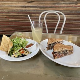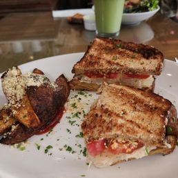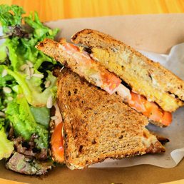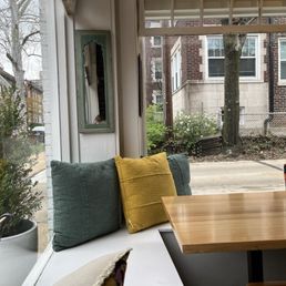 Rootz beet carrot apple lemon ginger juice is heavenly and OH MY GOD this Italian smoked tempeh sandwich on toasted sprouted grain bread is literally the best sandwich I've ever had! Green goddess side salad is delicious. Brownie bite was OK, but the oatmeal cranberry cookie bite is AMAZING! UPDATE: I brought home some of the cookie bites and 10 seconds in the microwave made the brownie bite taste like a warm fudgy brownie. It was delicious! This is my new go to place in St. Louis. Great service and great window seats and birds chirping outside.
